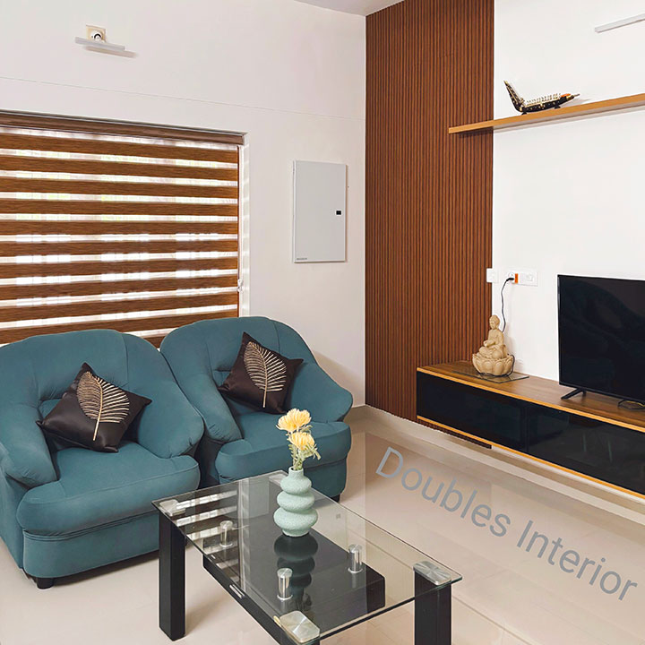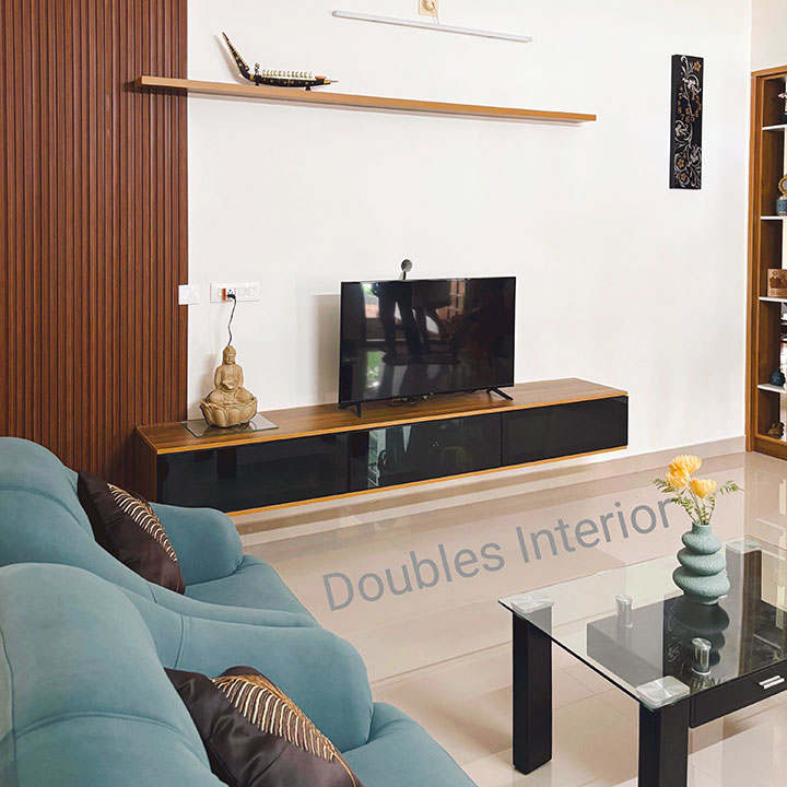 മിനിമൽ എലെമെന്റുകൾ നൽകി ചെയ്ത ടിവി യൂണിറ്റ് ഡിസൈൻ. ടിന്റഡ് (Tinted) ഗ്ലാസ് ഡോറുകളാണ് ടിവി കൺസോളിനു നൽകിയിരിക്കുന്നത്. യൂണിറ്റിന്റെ ഒരു സൈഡിൽ WPC ലൂവറുകളും നൽകി.