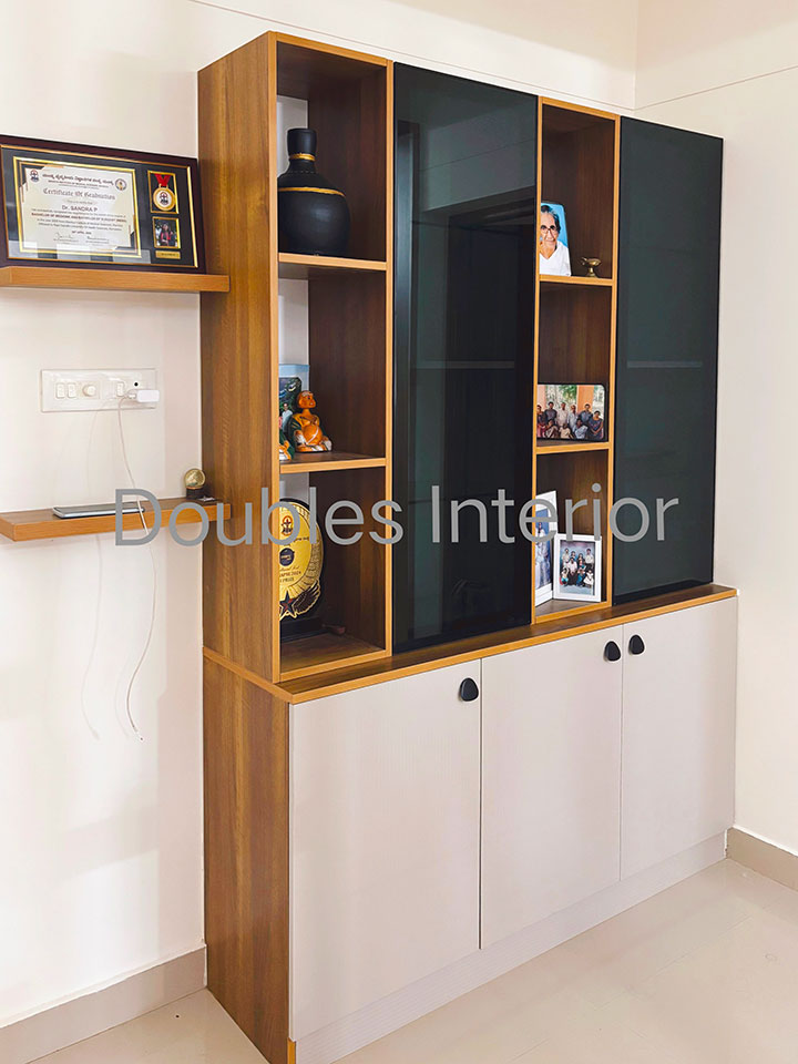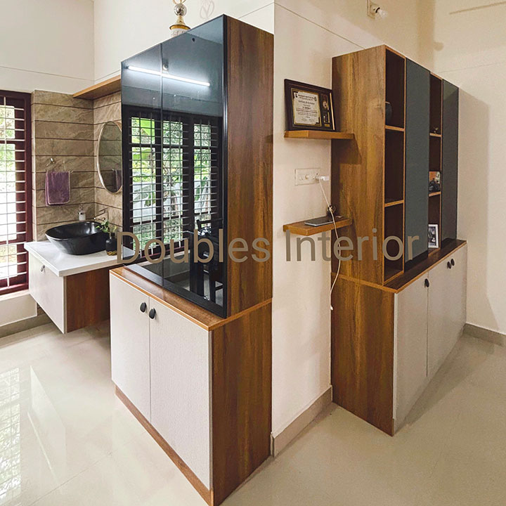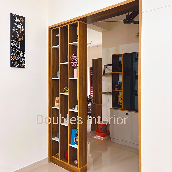 സ്റ്റോറേജ് സൗകര്യത്തോടു കൂടിയ വുഡൻ ഷെയിഡിലുള്ള പാർട്ടീഷൻ.