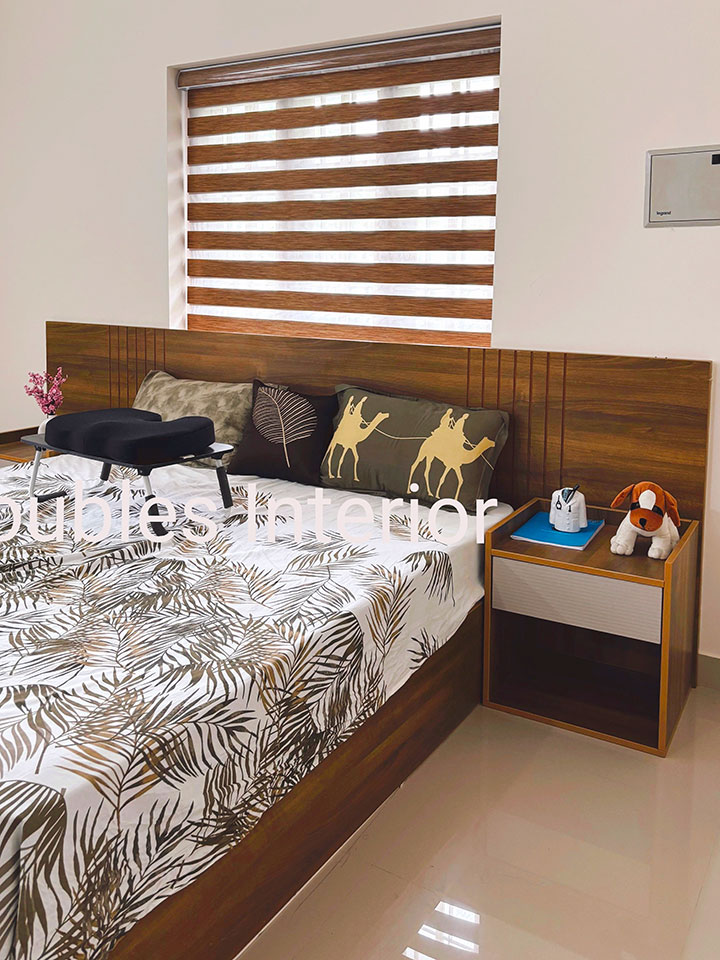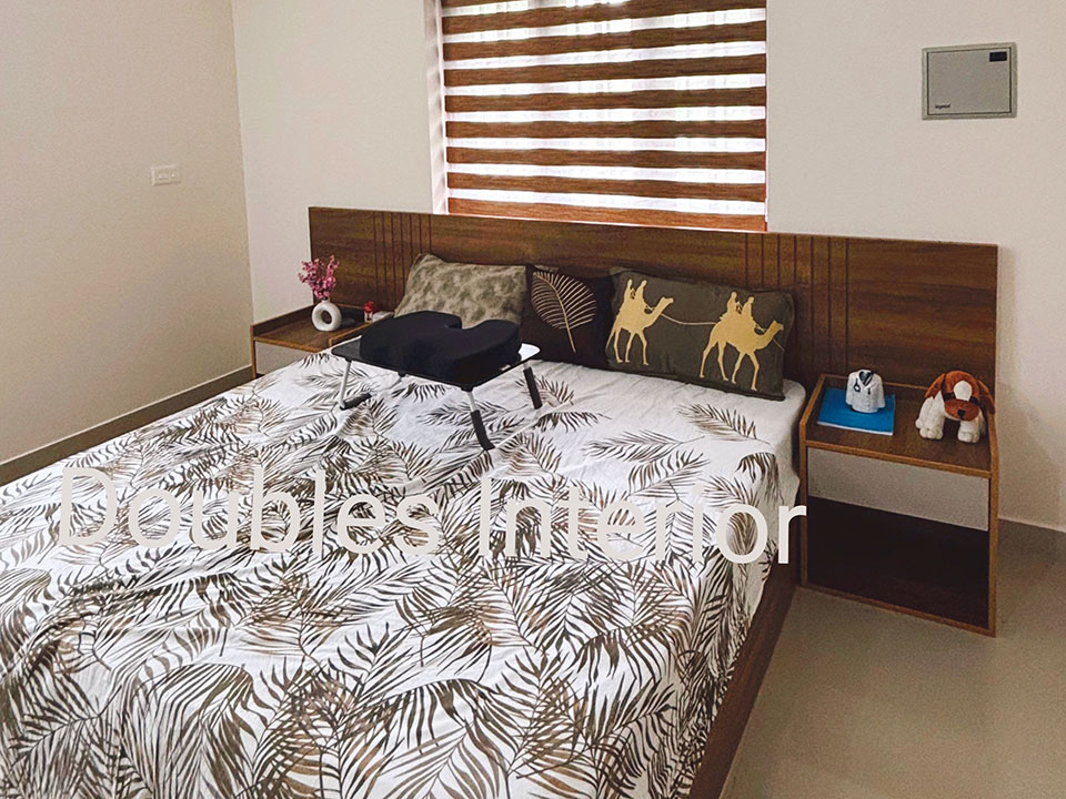 മനോഹരമായ ഹെഡ് ബോർഡും ഇരുവശത്തും സൈഡ് ടേബിളുകളുമുള്ള കസ്റ്റമൈസ് ചെയ്ത ബെഡ് കോട്ട്.