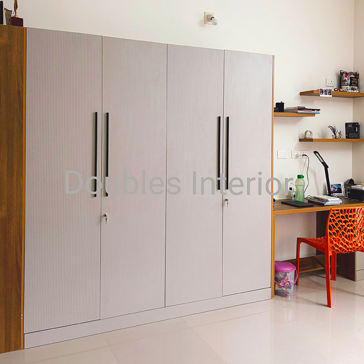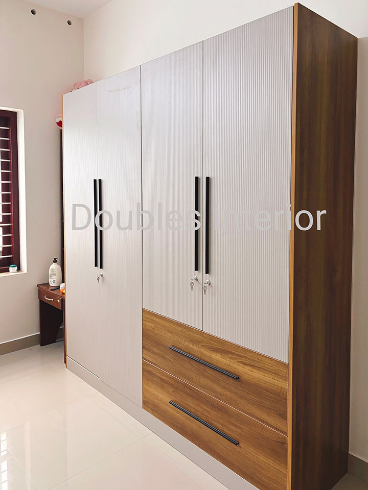 വൈറ്റ് ഷേഡ് ഫ്ലൂട്ടർ ടെക്സ്ചർ ലാമിനേറ്റ് ഷട്ടറുകളിലുമുള്ള 4 ഡോർ വാർഡ്രോബ്. രണ്ടു ഡോറുകൾക്കു നൽകിയിരിക്കുന്ന വുഡൻ ഷെഡ് വാർഡ്രോബിന്റെ ഭംഗി വർദ്ധിപ്പിക്കുന്നു.