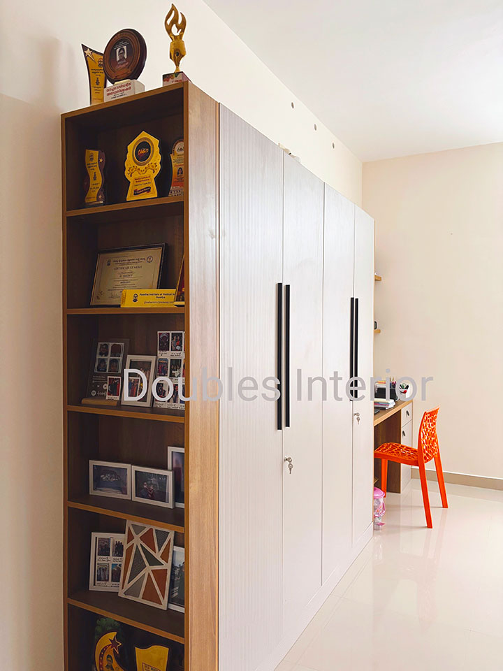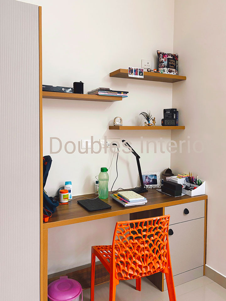 വാർഡ്രോബിന്റെ ഒരു വശത്തായി ഒരു സ്റ്റഡി ടേബിളും അതിനു മുകളിലായി ഓപ്പൺ സ്റ്റോറേജുകളും നൽകി.