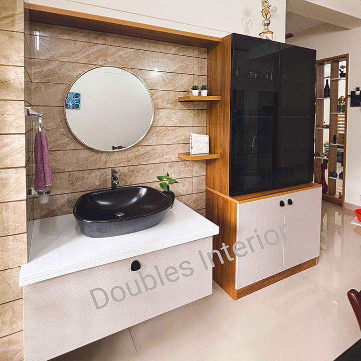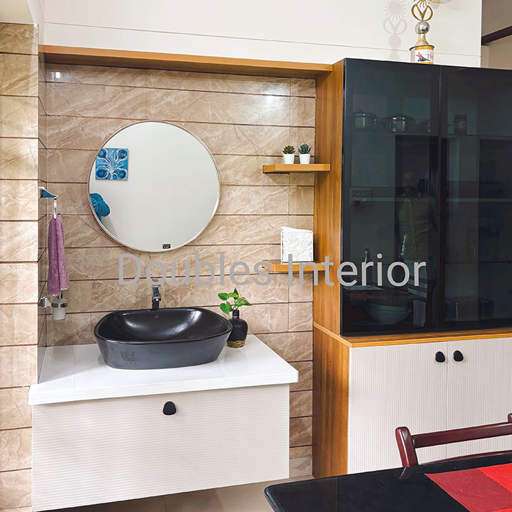 ഡൈനിങ് ഏരിയയിൽ രൂപകൽപ്പന ചെയ്ത വാഷ് ഏരിയയും ക്രോക്കറി യൂണിറ്റും വുഡൻ വൈറ്റ് ഷേഡിലാണ് ചെയ്തിരിക്കുന്നത്.