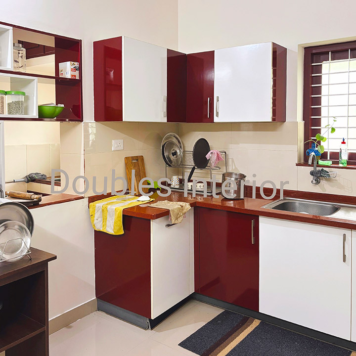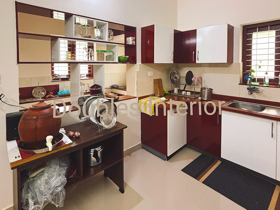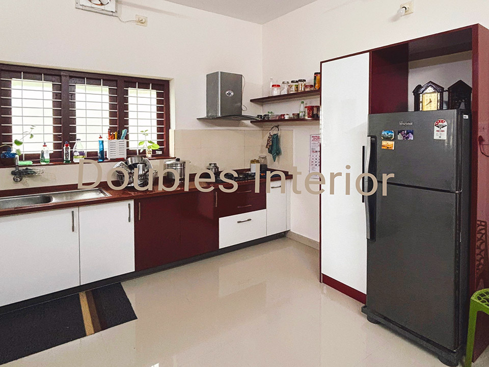 മറൈൻ പ്ലൈയിൽ വൈറ്റ്, ചെറി റെഡ് കളറിലുള്ള ലാമിനേഷൻ നൽകിയാണ് മോഡുലാർ കിച്ചൺ ഒരുക്കിയത്.