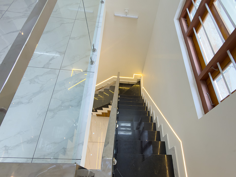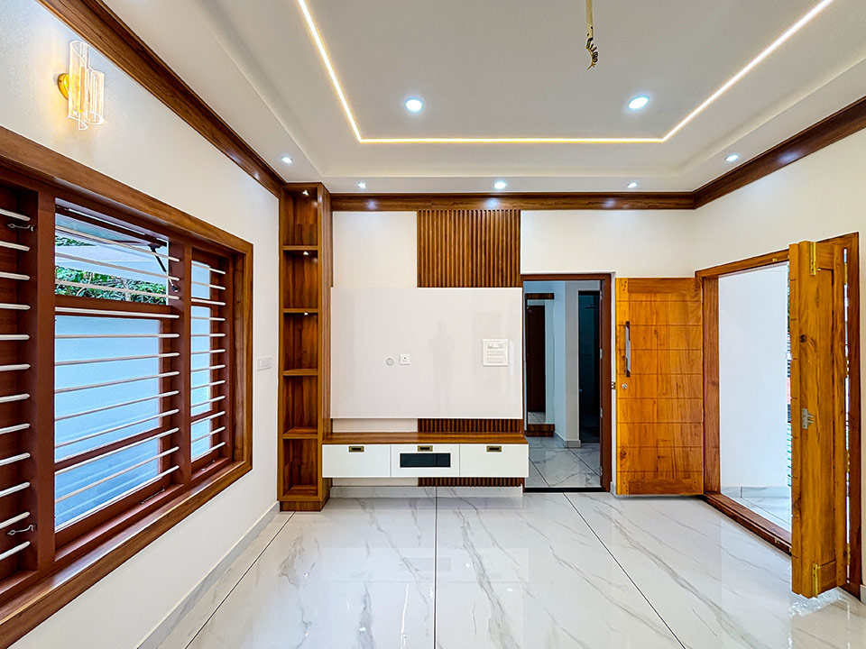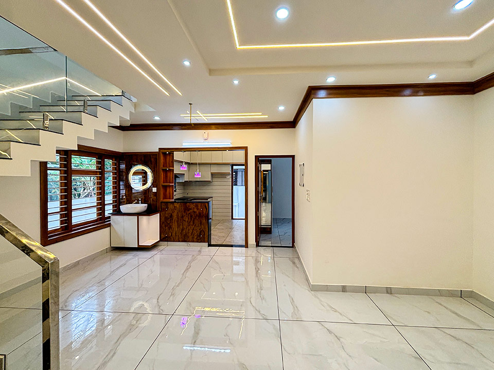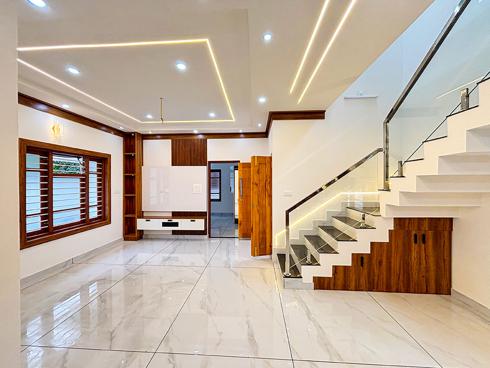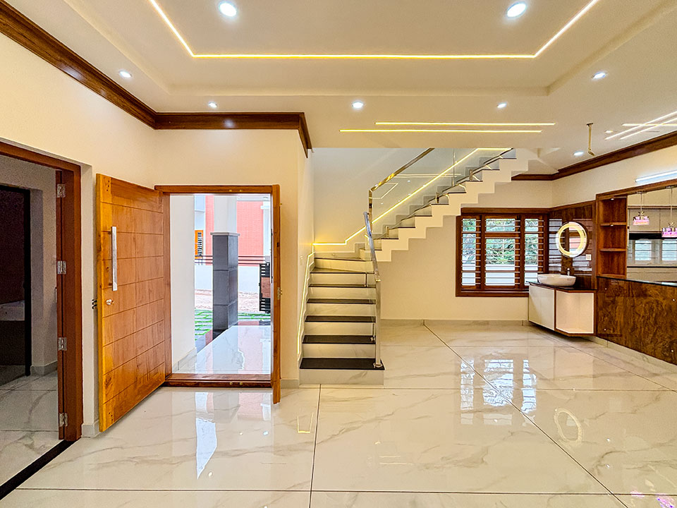 വിശാലതയോടു കൂടി മനോഹരമായി നിർമ്മിച്ച ഇന്റീരിയർ ആണ് വീടിന്റെ എടുത്ത് പറയത്തക്ക പ്രത്യേകത. അതിനോട് യോജിക്കുന്ന രീതിയിൽ തന്നെ പ്രൊഫൈൽ ലൈറ്റുകളോട് കൂടിയ ജിപ്സം സീലിംഗ് ആണ് ഇവിടെ കൊടുത്തിരിക്കുന്നത്.