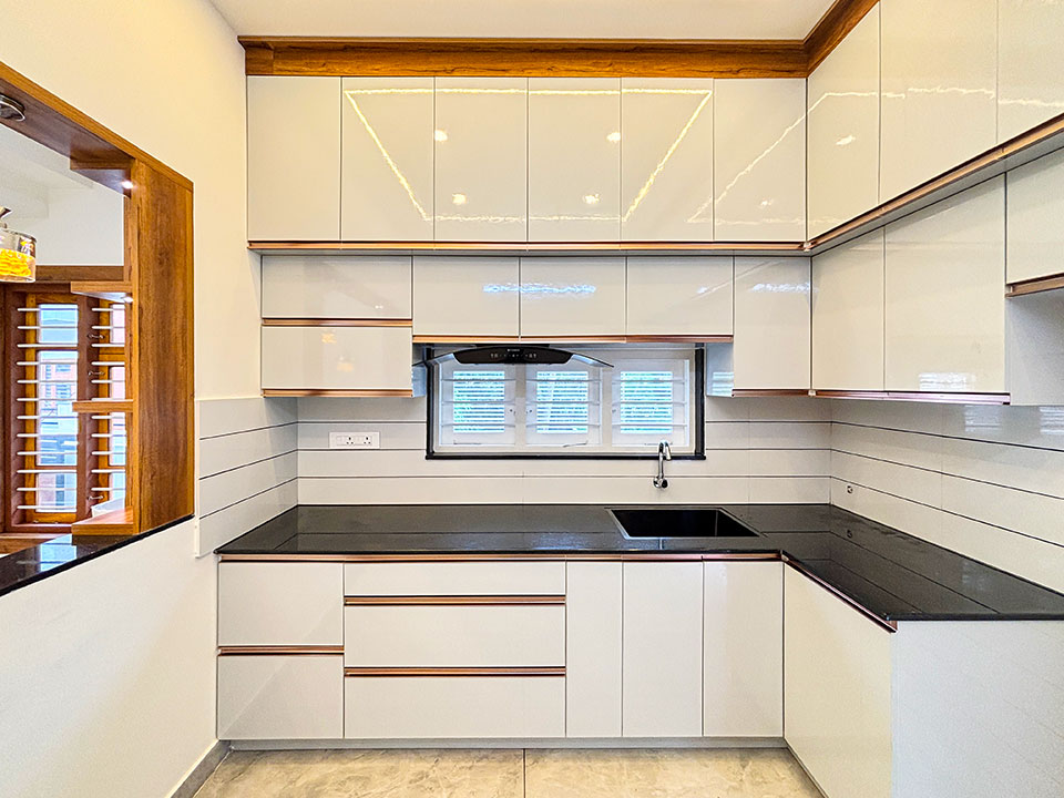 വൈറ്റ് തീമിൽ മറൈൻ പ്ലൈവുഡ് - ലാമിനേഷൻ കോമ്പിനേഷനിൽ ആണ് മോഡുലാർ കിച്ചൻ ചെയ്തിരിക്കുന്നത്