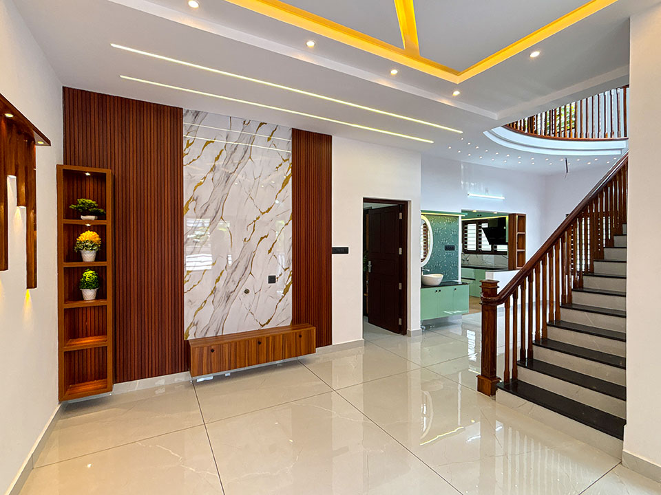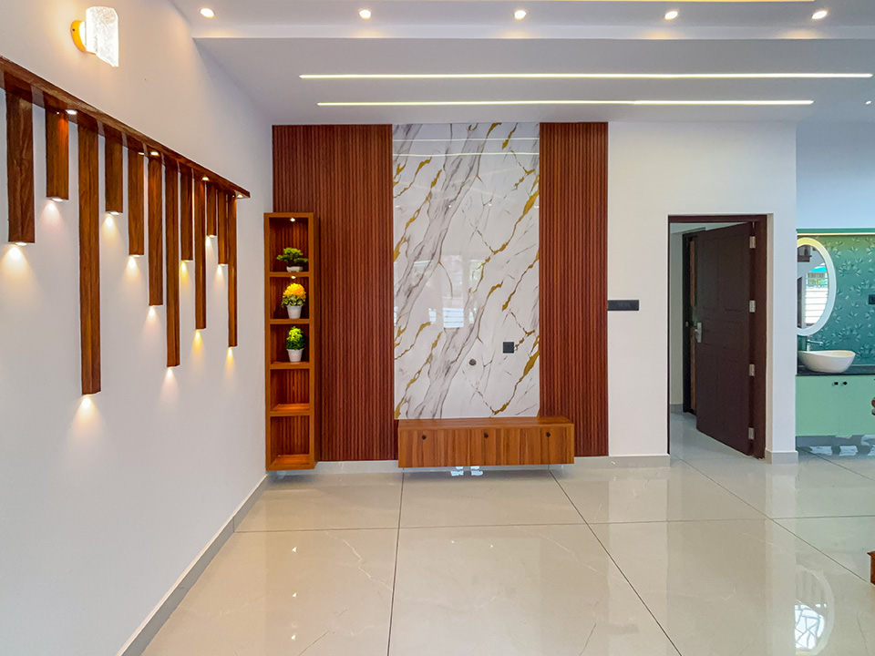 ഓപ്പൺ പ്ലാൻ ശൈലിയിലാണ് വീടിന്റെ ഡിസൈൻ ചെയ്തിരിക്കുന്നത്. ലിവിങ് റൂമിലെ ടി വി യൂണിറ്റ് വെർട്ടിക്കൽ വാൾ പാനലിങ് ചെയ്ത് ഫ്ലൂട്ടട് (Fluted) ഡിസൈൻ നൽകിയിട്ടുണ്ട്.