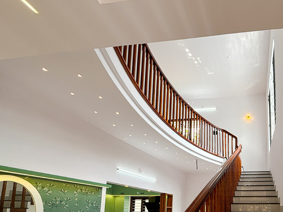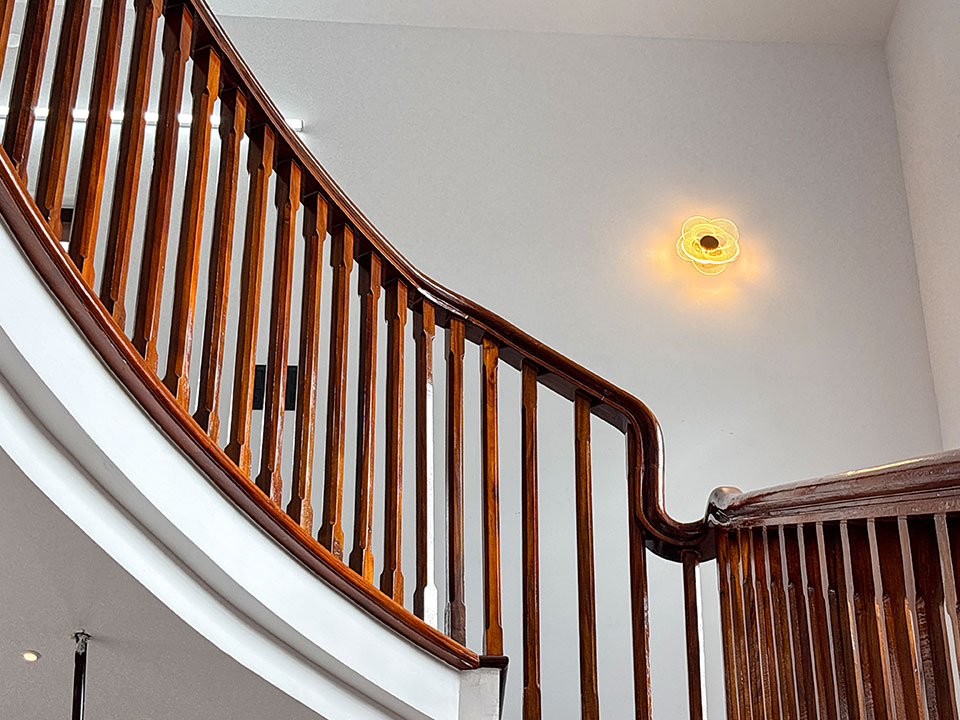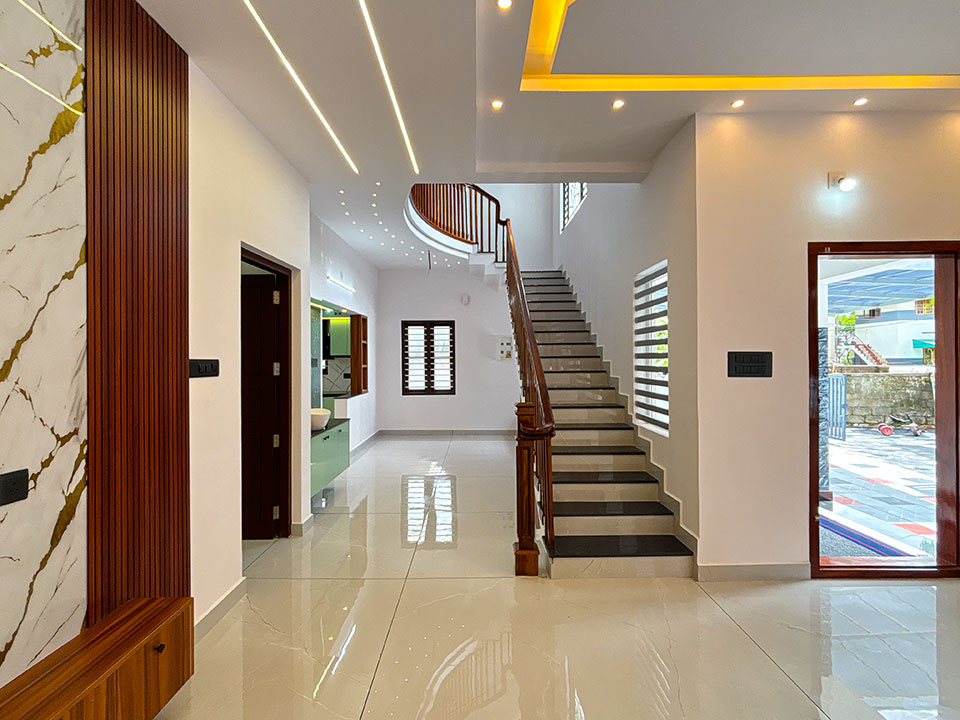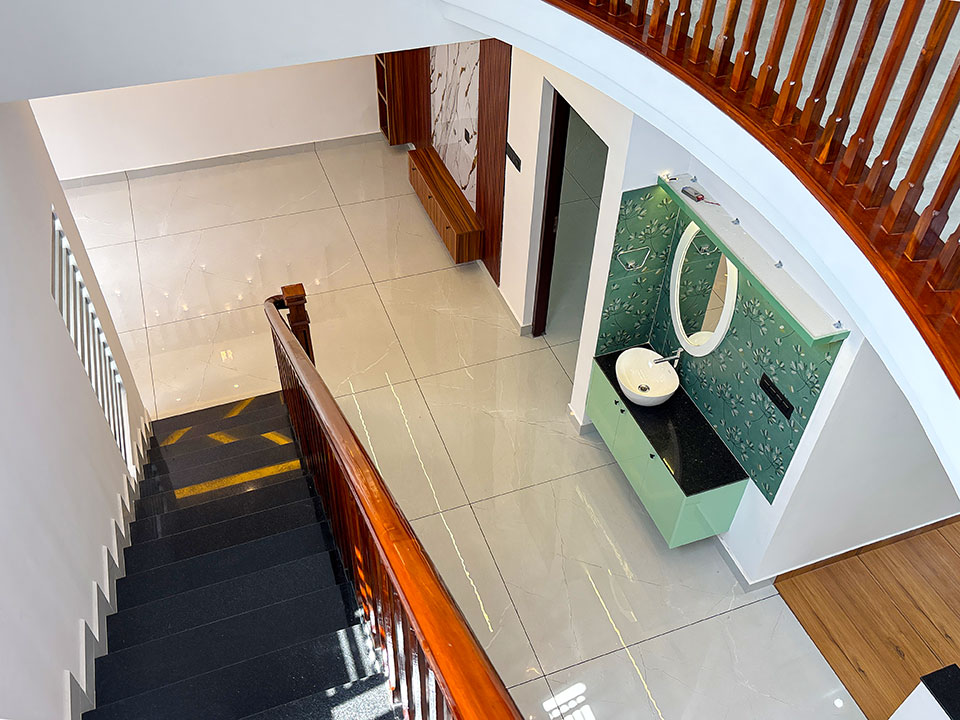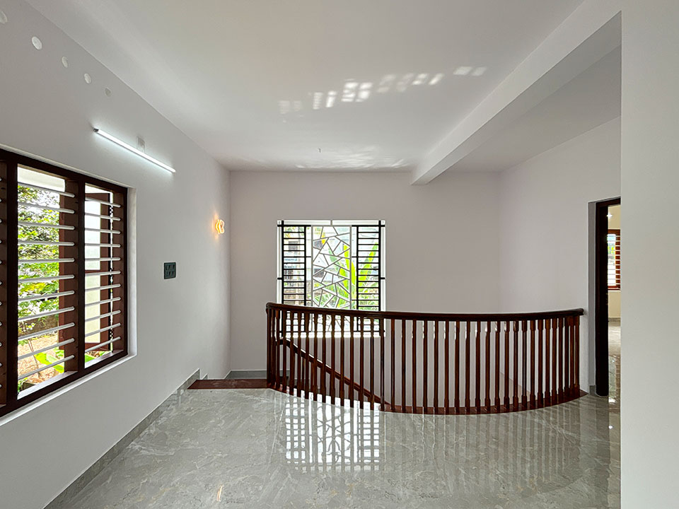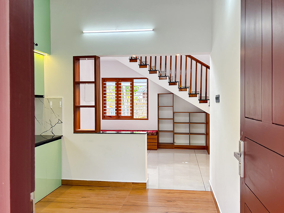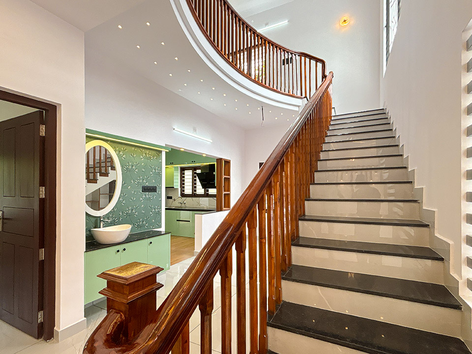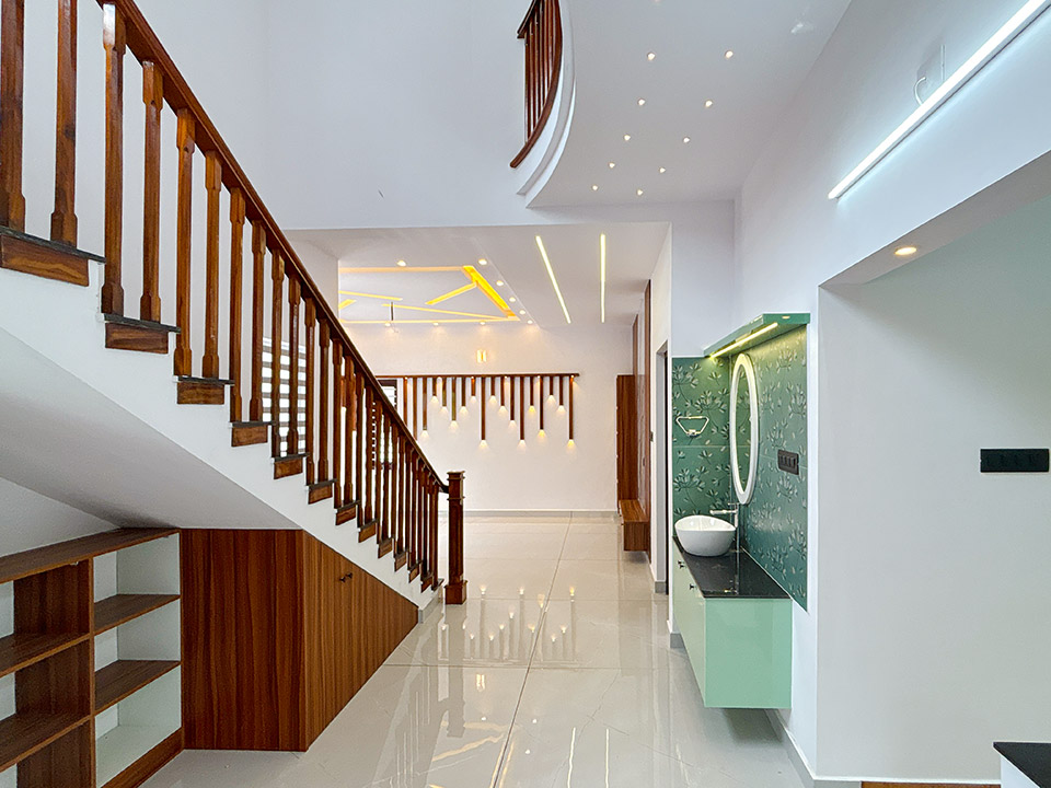 തേക്ക്/അക്കേഷ്യ തടികൾ കൊണ്ടുണ്ടാക്കിയ ഹാൻഡ്റൈൽ നൽകിയാണ് സ്റ്റെയർകേസ് ചെയ്തിരിക്കുന്നത്. സ്റ്റെയർകേസിന്റെ അടിയിൽ ഒരു കോംപാക്ട് സീറ്റിങ് ഏരിയയും അതിനൊപ്പം തന്നെ ചെറിയ സ്റ്റോറേജ് സ്പേയ്സും ഒരുക്കിയിട്ടുണ്ട്.