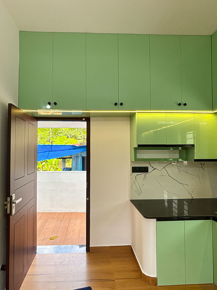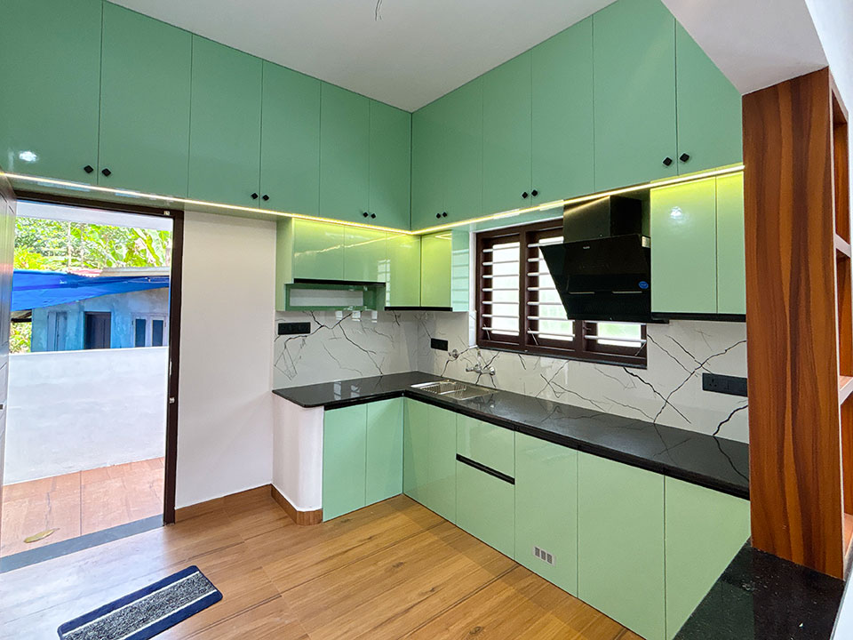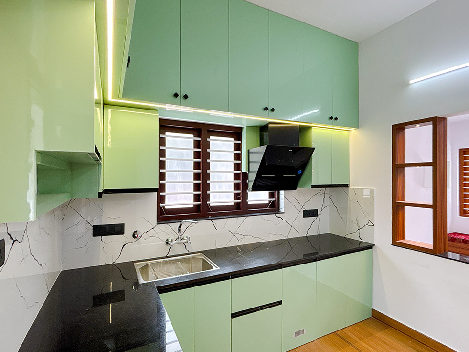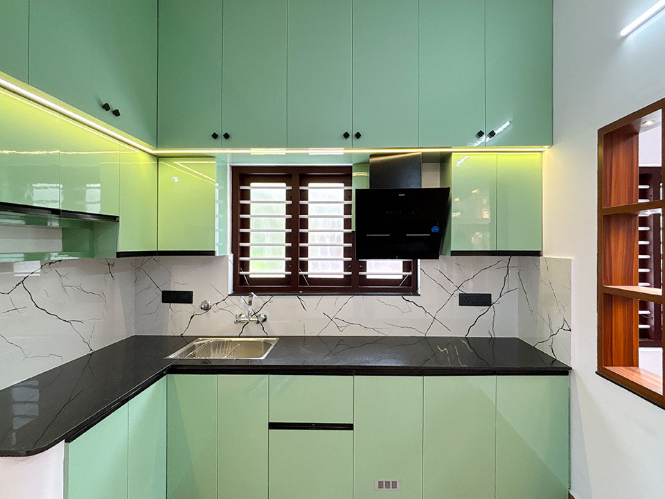 സേജ് - ഗ്രീൻ കളർ കോമ്പിനേഷൻ വരുന്ന മറൈൻ പ്ലൈവുഡിൽ ലാമിനേറ്റ് നൽകിയാണ് മോഡുലാർ കിച്ചൻ ഡിസൈൻ ചെയ്തിരിക്കുന്നത്.