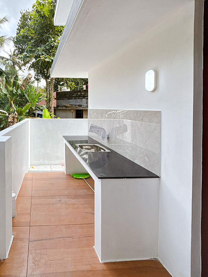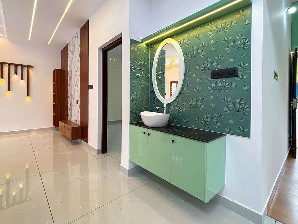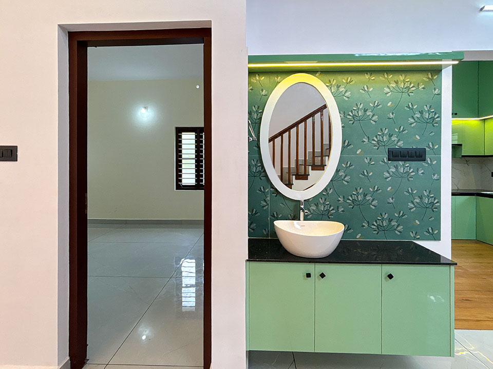 ഡൈനിങ്ങ് ഏരിയയുടെ അടുത്തായി ഒരു കോർണർ വാഷ് യൂണിറ്റ് കൊടുത്തിട്ടുണ്ട്. ഭംഗിയുള്ള സേജ് - ഗ്രീൻ നിറത്തിലാണ് വാഷ് യൂണിറ്റ് ഡിസൈൻ ചെയ്തിരിക്കുന്നത്.