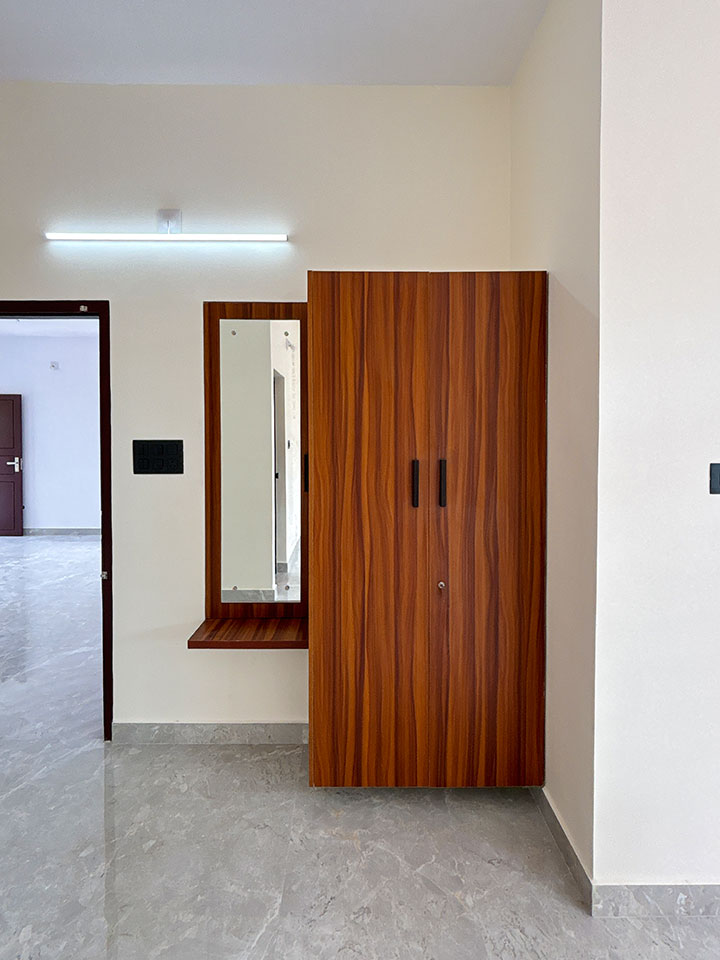 മൂന്ന് ബെഡ്റൂമുകളാണ് ഈ വീട്ടിൽ നൽകിയിട്ടുള്ളത്. എല്ലാ മുറികളിലും വാർഡ്രോബുകൾ നൽകിയിട്ടുണ്ട്.