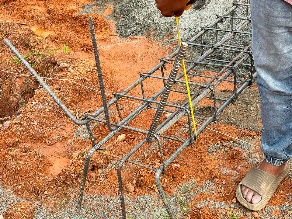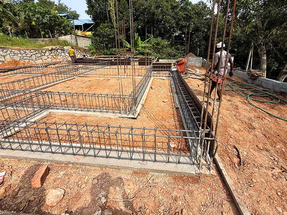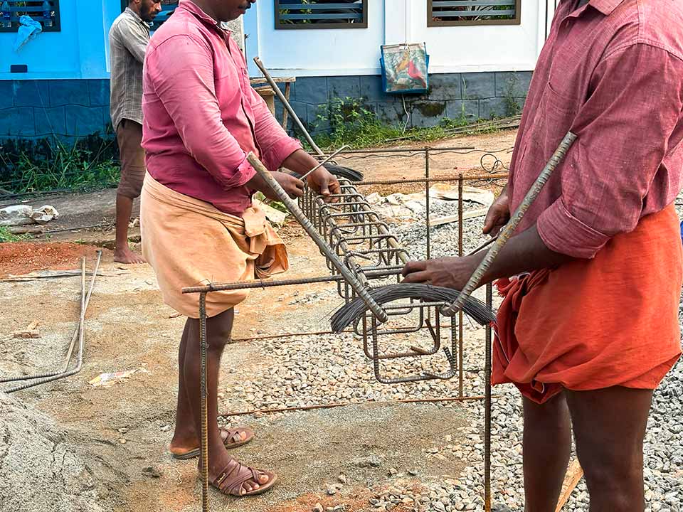 ഡ്രോയിങ് പ്രകാരം കോളം ഫൂട്ടിങ്ങിനും തറയിൽ നൽകുന്ന മാറ്റിനും വേണ്ട കമ്പി കെട്ടി PCC യ്ക്കു മുകളിൽ സ്ഥാപിച്ചു.